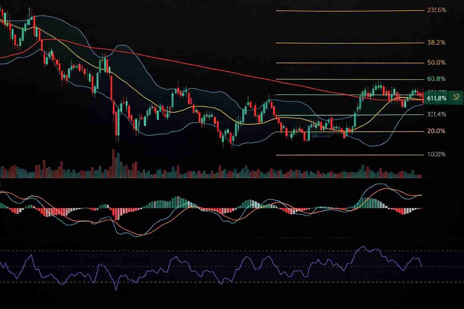تشمل أدوات التحليل الفني: المتوسطات المتحركة (Moving Averages)، MACD، بولنجر باند (Bollinger Bands)، فيبوناتشي (Fibonacci Retracements)، وحجم التداول (Volume)، وكلها تساعد على فهم حركة السعر واتخاذ قرارات استثمارية مدروسة.